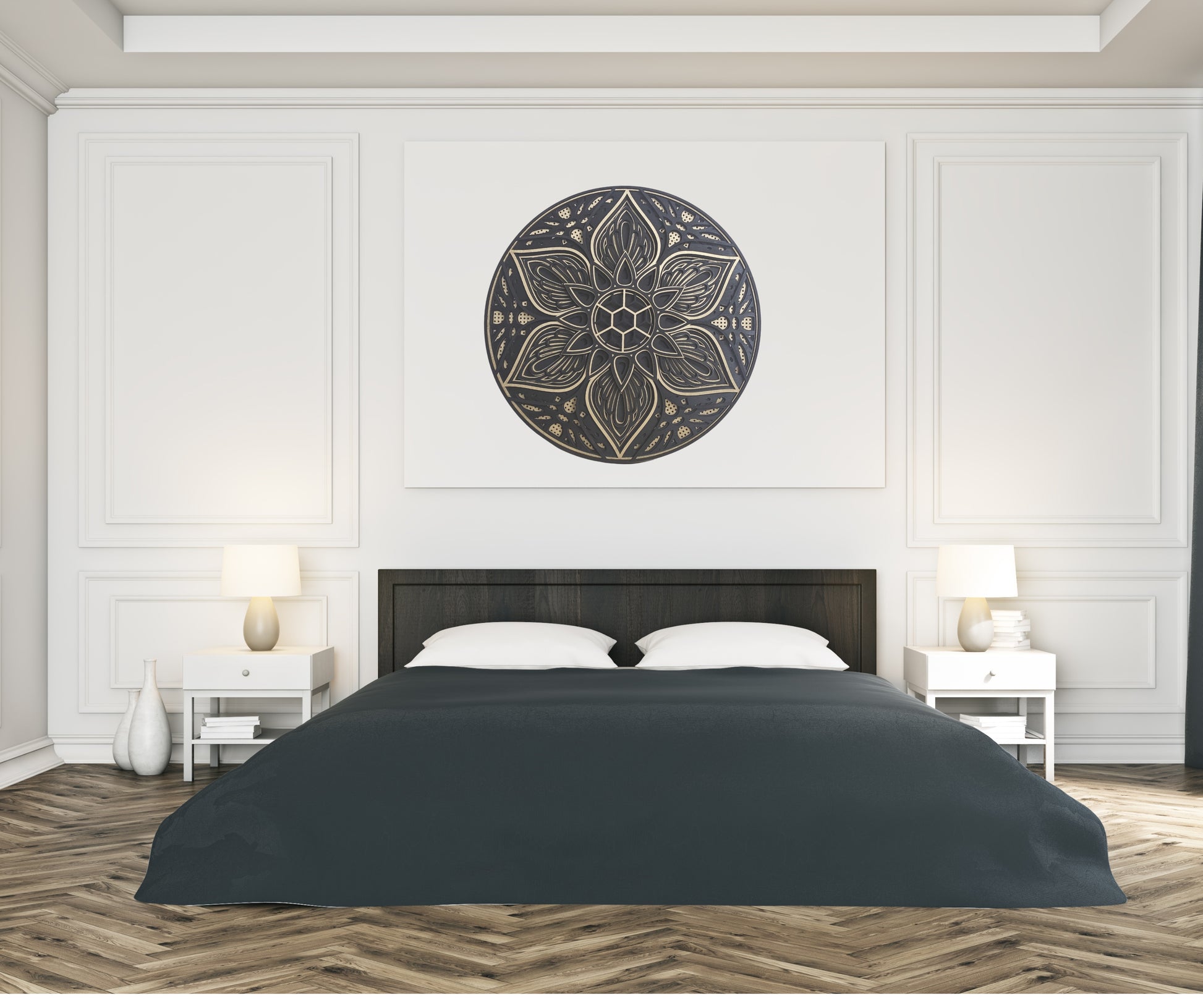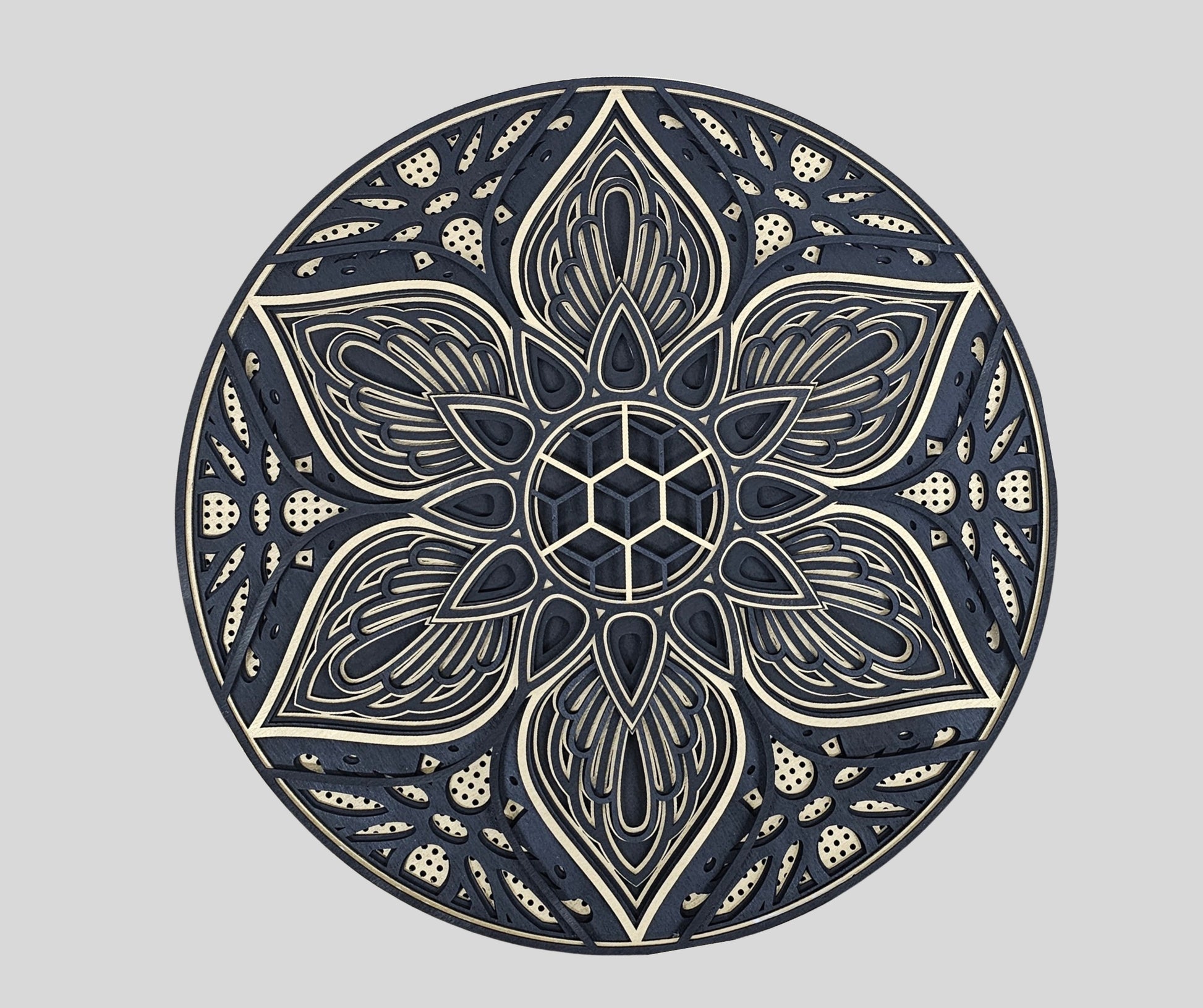 Prosta, ale pełna mocy – ta mandala w odcieniach złota i czerni to symbol równowagi i transformacji. Złoto wnosi do niej światło, mądrość i spokój, a czerń dodaje głębi, tajemniczości i przestrzeni do refleksji. Kwiat w centrum przypomina o ciągłym duchowym rozwoju i pięknie wynikającym z wewnętrznej harmonii.